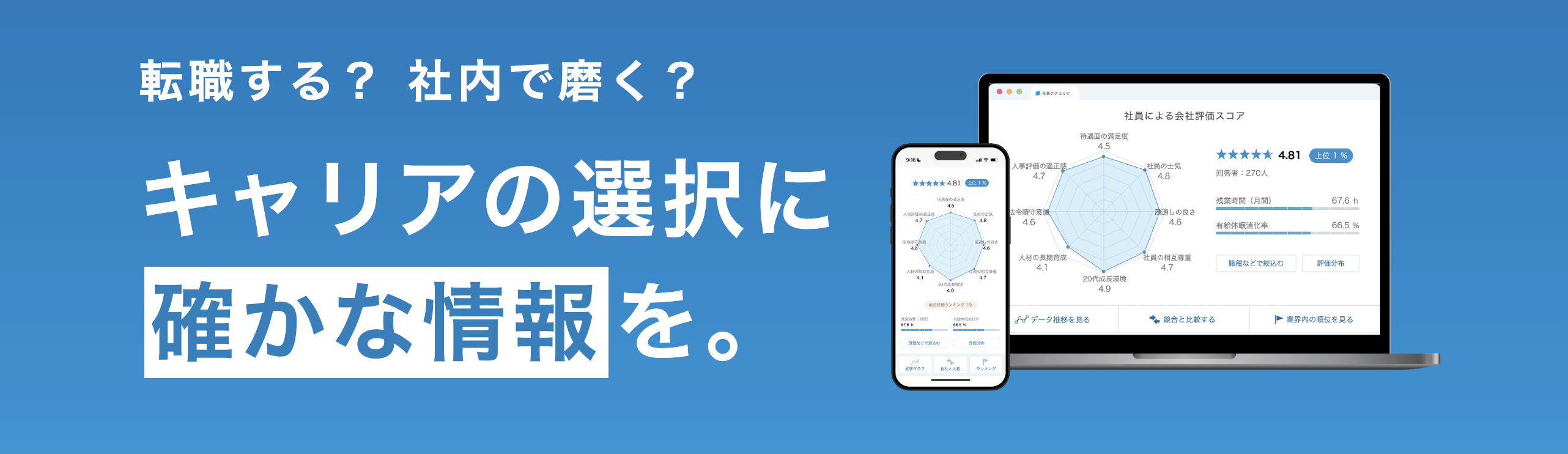 強み:企業の平均年収・残業時間・職場満足度などを数値で可視化。