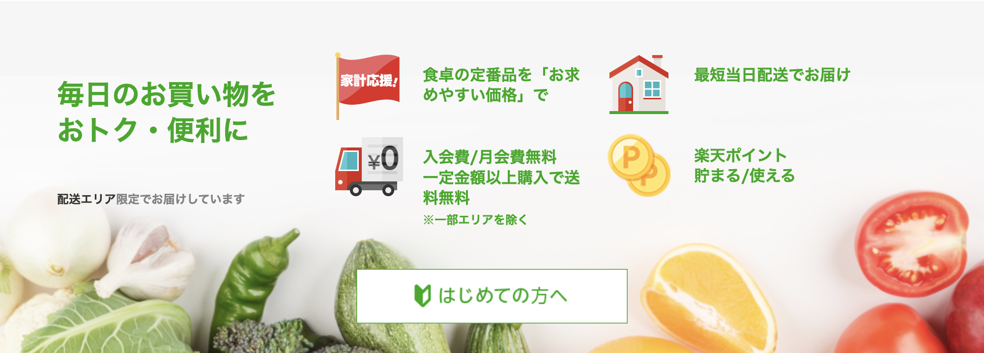 楽天ポイントを貯めたい人向け。対応エリア内なら「いつもの買い物」を楽天経由でまとめやすい。