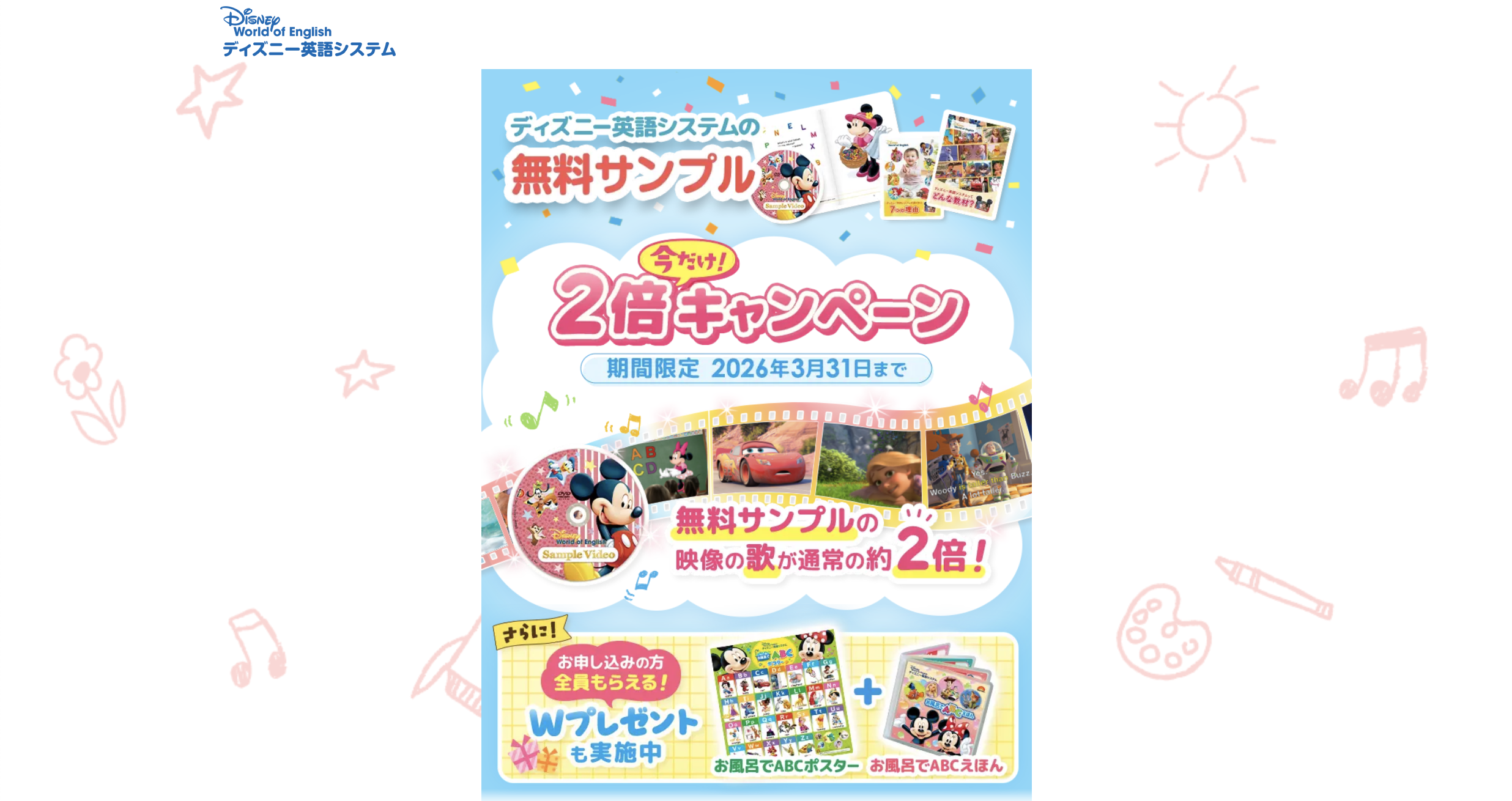 ディズニー英語システムは、映像・音声・絵本・遊びがつながりやすく、家族の生活導線に乗せやすいのが強みです。特に忙しい家庭ほど「完璧にやらなくていい」設計が助けになります。いきなり大きな決断をする必要はありません。まず無料サンプルで、お子さまが歌に反応するか、映像を楽しめるか、家の中で回せそうかを見てから考えるのが一番安心です。