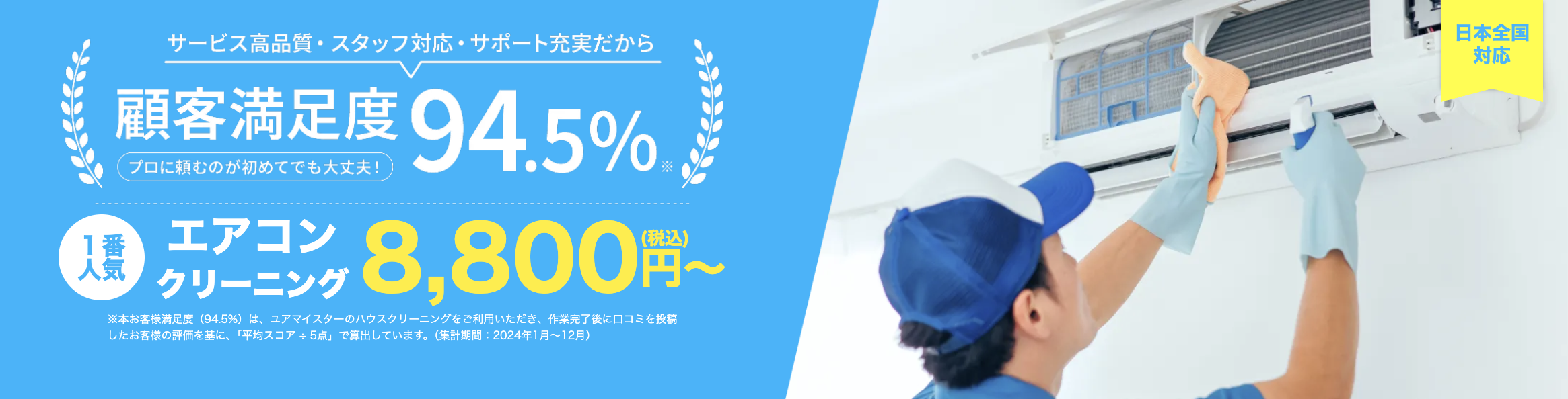 ユアマイスターは、業者マッチング型の色が強く、価格重視で探したい人に向いています。公式案内では通常タイプ12,800円(税込)や、別の公式掲載では8,800円(税込)から見られるなど、依頼先やプランにより価格差があります。そのため、安く見つかる可能性はありますが、担当業者による差も出やすいです。