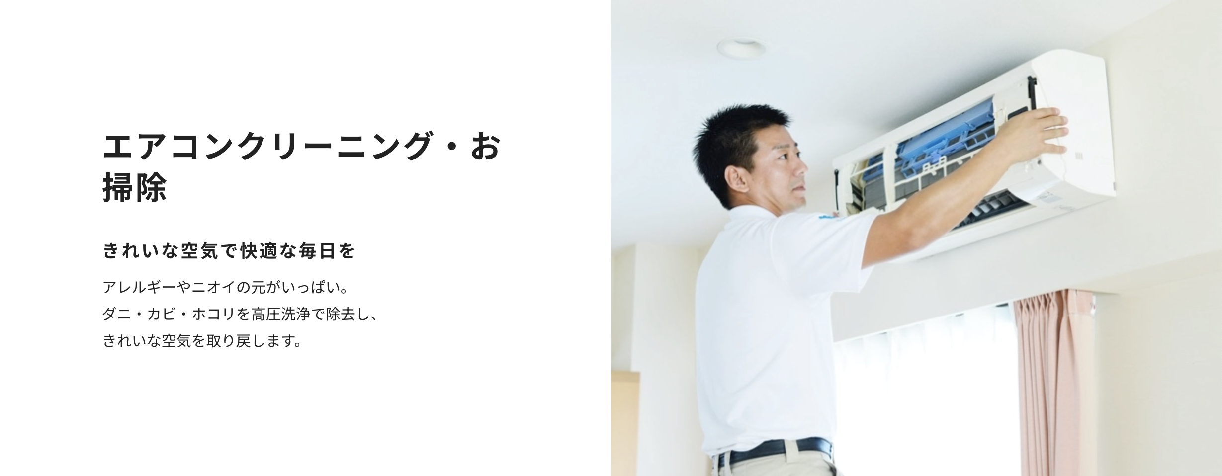 子ども部屋のエアコンのカビが心配で利用しました。お掃除機能付きでも内部は汚れると聞いて納得しました。作業後は見た目だけでなく安心感が違いました。